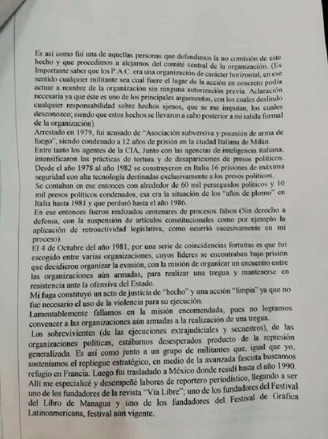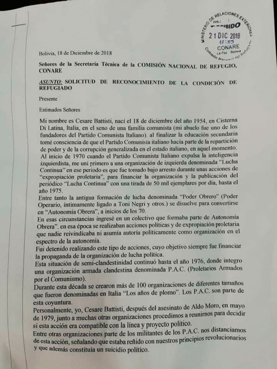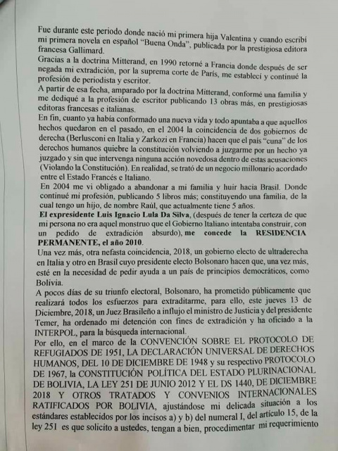 (*) Ver texto de la declaración de Cesare Battisti pidiendo refugio en Bolivia antes de su detención, en las imágenes adjuntas.