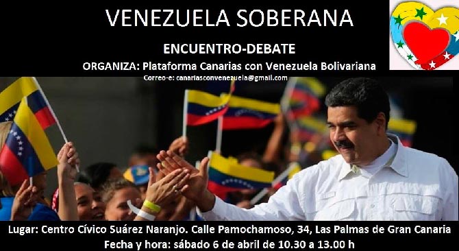 El sábado 6 de abril tendrá lugar el Encuentro/Debate “Venezuela Soberana”, organizado por la Plataforma Canarias Con Venezuela Bolivariana.