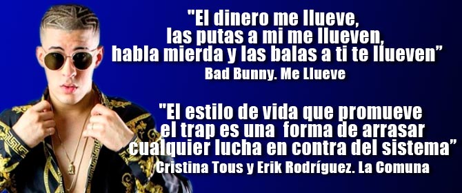 “Lo que me atrae del Trap es la forma de contar las cosas, todo muy crudo y provocador, vacilando constantemente, hablando de cosas feas: de putas, de droga y de dinero.” Podría parecer una provocación, una forma de protesta ante el sistema que hace que la gente que nace en barrios obreros no tengan otra salida si quieren sobrevivir en el “ghetto”. Pero no es así. Su mensaje promociona los valores del capitalismo más salvaje, son esclavos de las marcas, de la cosificación de la mujer, de los coches caros… en general la vida que llevan “los ricos”.
