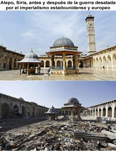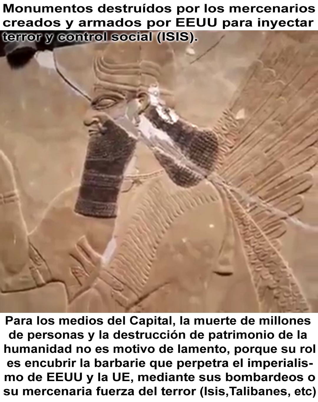 Poco les importa la destrucción del patrimonio cultural de la humanidad a los medios del Capital, si esta se produce por las "expediciones punitivas" de los autoproclamados "policías del mundo", descargando sus bombas y mercenarios sobre la magnificencia perdida para siempre de Palmira o de Alepo (Siria), sobre las preciosas Hatra, Mosul y Nimrud descuartizadas (Irak), sobre Saná supliciada (Yemen); poco les importa a los medios del Capital que los mercenarios del imperialismo estadounidense y europeo, adiestrados en fanatismo para sembrar el caos controlado, destruyan patrimonio en Tombuctú (Mali) o en Bamiyan (Afganistán), por citar solo dos ejemplos. Y los seres humanos lacerados, torturados, amputados y empujados a los caminos del éxodo, importan menos todavía a ojos de esos medios cuyos dueños atesoran también en base al saqueo y la explotación... queda claro que para los imperios los seres humanos son menos importantes que la acumulación capitalista.