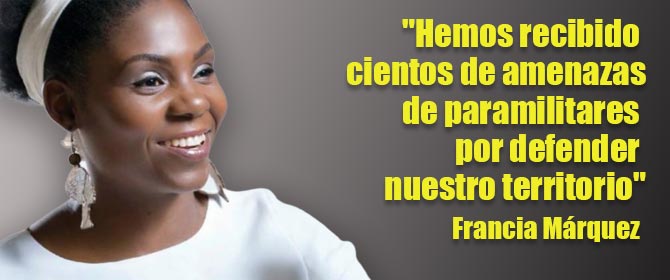 “Somos descendientes de esclavos africanos. Vivimos de la minería artesanal y la agricultura. No somos dueños de la naturaleza, somos parte de ella” [8], expresó Francia Márquez. «Hemos recibido cientos de amenazas de paramilitares que dicen que nos declaran objetivo militar porque nos oponemos al “desarrollo”. ¿Cuál desarrollo? Si en nombre de ese desarrollo esclavizaron a mi comunidad , en nombre de ese desarrollo nosotros hemos vivido en condiciones de empobrecimiento y es por eso que hemos decidido luchar por defender ese territorio, lo cual implica poner en riesgo hasta la propia vida»[ibídem].