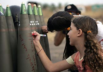 [3] Hay numerosa documentación fotográfica del adoctrinamiento que padecen las y los niños a manos del Estado israelí. Entre las fotografías más reveladoras se encuentran las que realizó la agencia AP, de varias niñas firmando obuses antes de ser lanzados sobre el Líbano. "Desde temprana edad, estos chicos son adoctrinados y educados bajo estas señales, cuyo resultado es lo que hoy se observa. No es extraño ver niños israelíes escribiendo mensajes en los misiles que son lanzados por sus militares, deseándoles éxitos y la máxima cantidad de víctimas. Tampoco es extraño ver cómo colonos, paramilitares y los propios militares israelíes, se jactan y se enorgullecen de agredir, torturar e incluso asesinar a palestinos. Camisetas con frases como “Una bala dos muertos”, refiriéndose a disparar a mujeres palestinas embarazadas, o como asesinar a chicos palestinos, son llevadas con orgullo por los militares".