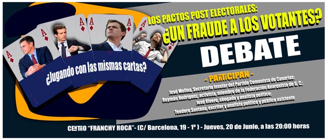 Para discutir sobre estas cuestiones desde diferentes posiciones políticas, el Centro Franchy Roca de Las Palmas de G.C. contará el   jueves 20 de junio, a las 20 horas,  con José Molina, coordinador insular de IUC, el abogado y analista político José Rivero, el escritor y también analista político Teodoro Santana y el activista social Ruymán Rodríguez, miembro del Sindicato de Inquilinas y la Federación Anarquista de Gran Canaria.