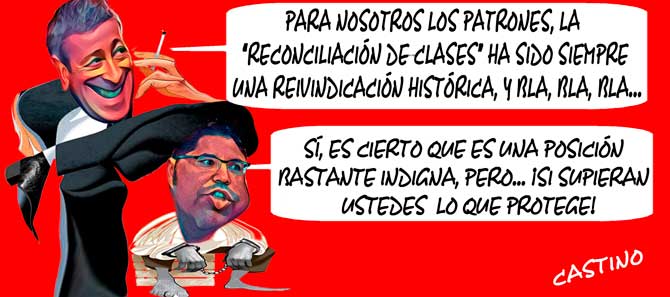 Como es posiblemente sabido, una de las aspiraciones doctrinales del desaparecido líder de los fascistas españoles era lograr la "conciliación de las clases sociales". O dicho de otra manera, hacer posible que los patrones pudieran triplicar sus beneficios sin suscitar con ello la malsana envidia de los desgraciados proletarios, que siempre están reivindicando que les suban los salarios y les reduzcan las horas de trabajo. Algo que no es compatible -argumentan los patronos- con "una economía pujante y competitiva".