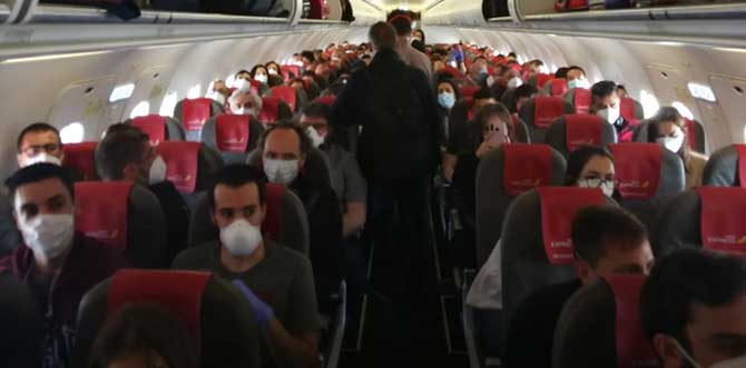 En los momentos previos al despegue del vuelo, de Iberia Express, los pasajeros no podían creerse cómo la aeronave se iba llenando hasta que se dejaron de cumplir las distancias de seguridad mínimas establecidas por Sanidad.