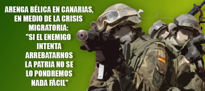 ¿ Están esperando, por ventura los altos mandos del Ejército español un inminente ataque militar africano contra el Archipiélagop canario? ¿ O considera, quizá el alto mando castrense, coincidiendo con lo que proclama estos dias el ultraderechista Jiménez Losantos, que los inmigrantes desesperados que en estos días llegan a nuestras costas en cayucos son "una avanzadilla" de la temida invasión militar? Al menos esto es lo que se da a entener en el vídeo filtrado de la arenga de un mando de infantería a su tropa (...).