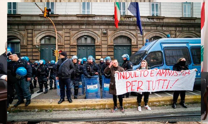 En las imágenes se observa cómo varios guardias italianos arrojan a los prisioneros al suelo, mientras los patean y golpean con porras en la cárcel Santa María Capua Vetere. Los hechos habrían ocurrido el 6 de abril de 2020.
