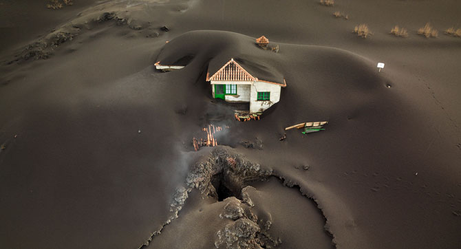 La casa en cuestión, a la que terminó por tragarse una enorme montaña de  ceniza proveniente de las erupciones volcánicas, y a cuyos pies se abre una nueva boca del Cumbre Vieja,  fue la  que el periódico eligió para cubrir su portada principal  en la edición en papel del  rotativo norteamericano