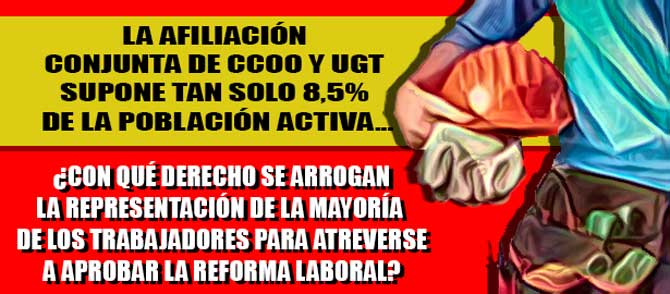 "los que se autoproclaman "agentes sociales" no representan ni a todas las personas trabajadoras ni a todos los sindicatos existentes en el Estado español, por lo que no pueden negociar ni acordar nada que afecte al conjunto de trabajadoras y trabajadores del Estado. La afiliación conjunta de esos dos sindicatos supone alrededor del 8,5% de la población activa, por lo que el resto de dicha población, el 91,5%, o está afiliada a otros sindicatos, o no está afiliada a ninguno".