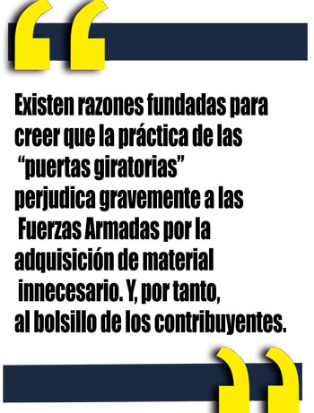 lado los múltiples informes existentes en ámbitos académicos, políticos o institucionales sobre lo pernicioso de las 'puertas giratorias', existen razones fundadas para creer que esta práctica perjudica gravemente a las Fuerzas Armadas por la adquisición de material innecesario. Y, por tanto, al bolsillo de los contribuyentes.