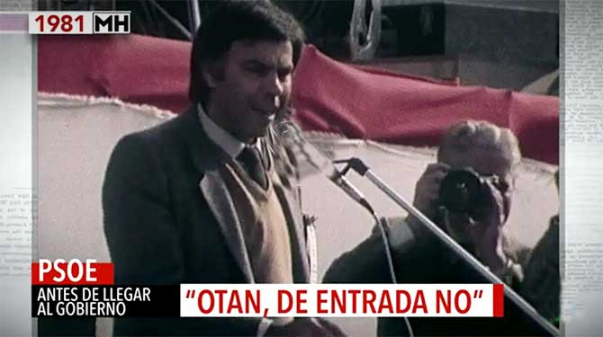 El PSOE, en la oposición, jugo a la ambigüedad. Su lema de campaña fue: OTAN de entrada No. Sin embargo, tras la mayoría absoluta en las elecciones de octubre 1982, Felipe Gonzalez y su gobierno variaron el rumbo. Habían dado el Sí bajo cuerda.