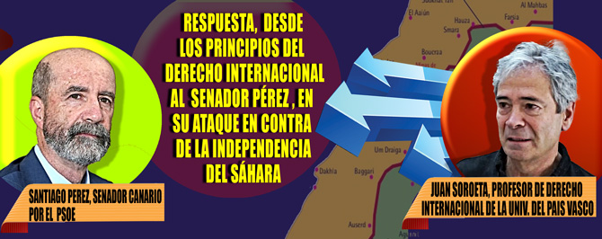 Juan Soroeta, profesor de Derecho Internacional en la Universidad del País Vasco, responde a un artículo del político tinerfeño del PSOE, Santiago Pérez, en el que este trata de justificar que la decisión del Gobierno español de apoyar la "autonomía" del Sahara Occidental ocupado por Marruecos, es una solución conforme con el Derecho internacional. "Voy a tratar de explicar - precisa el prof. Juan Soroeta - las razones por las que tal decisión constituye una violación grave del Derecho internacional por parte de nuestro país (...).