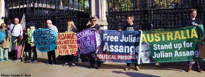 Cerca de diez mil personas se congregaron el pasado sábado 8 de octubre frente al Parlamento británico para crear una cadena humana que rodeara el edificio como protesta contra la extradición de Julian Assange a EE.UU. decretada por los tribunales de Gran Bretaña (...).