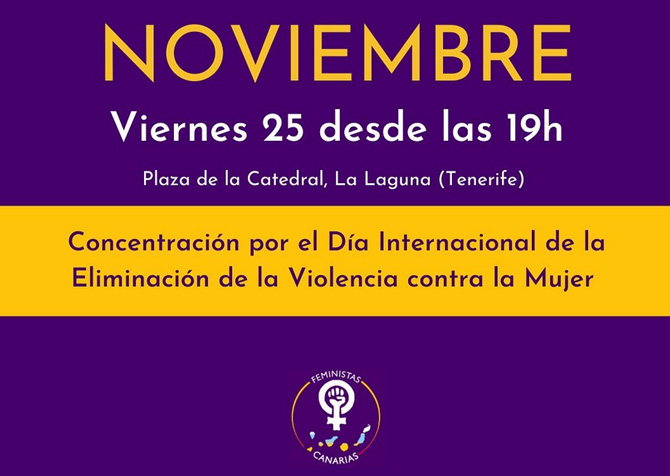 El colectivo Feministas Canarias ha realizado un llamamiento a participar en la concentración que, con motivo del Día Internacional de la Eliminación de la Violencia contra la Mujer, tendrá lugar el próximo viernes 25 de noviembre, desde las 19:00, en la Plaza de La Catedral de La Laguna de la isla de Tenerife (...).