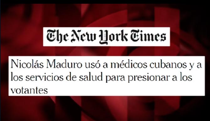 La última inmundicia ha sido un reportaje titulado “Nicolás Maduro usó a médicos cubanos y a los servicios de salud para presionar a los votantes” (14). El Times asegura que, en las últimas elecciones, cooperantes de Cuba iban “puerta por puerta, en barrios pobres”, para advertir que se “cortaría el acceso a los servicios médicos si no votaban por Maduro”.