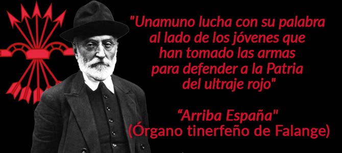 La más vigorosa personalidad literaria de España, Miguel de Unamuno, con ese arrebatado entusiasmo que ha puesto en todas sus obras, lucha con su palabra al lado de los que, más jóvenes que el ilustre anciano, han tomado las armas en la mano para defender a la Patria del ultraje rojo. La España moza se ha movido en muchas ocasiones al calor de la literatura unamunesca, contagiosa en su alta fiebre y revulsiva siempre para la comodidad escurridiza, el tímido conformismo y la voluntad y el pensamiento flojos.