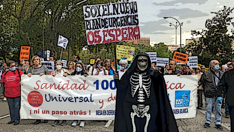 Podrá ser la respuesta generada por el pueblo madrileño, frente a la posición neoliberal más agresiva contra la Sanidad Pública que representa el Gobierno de la Comunidad de Madrid, todo un ejemplo para enfrentar la deriva sibilina que desde hace más de tres décadas se ha favorecido desde el Ministerio de Sanidad (bajo mandato de la derecha o de la socialdemocracia) que marca la pauta para que desde las distintas Consejerías Autonómicas al aplicar las competencias, se impulsen todo un conjunto de políticas a favor de los sectores con intereses lucrativos en el terreno sanitario, como mutuas patronales, compañías de seguros privados, corporaciones médicas, patronal de las clínicas privadas además de la industria farmacéutica y la de tecnologías sanitarias.