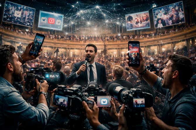 En esa misma lógica comunicativa, el Congreso o los espacios públicos son transformados en escenarios mediáticos donde lo importante no es tanto la información como el impacto emocional que pueda producir una escena de confrontación.