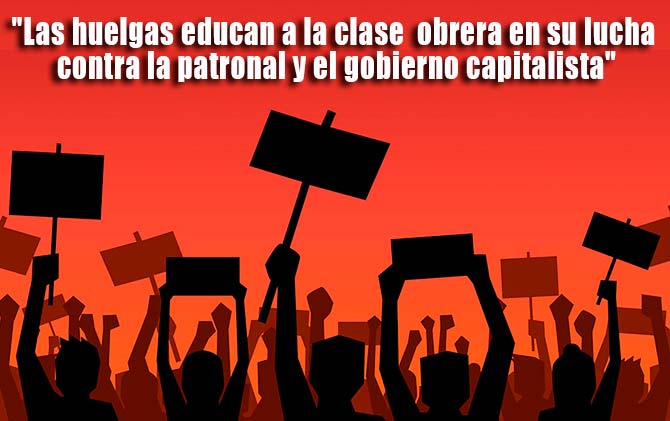 Así pues, las huelgas enseñan a los obreros a unirse, les hacen ver que sólo unidos pueden sostener la lucha contra los capitalistas, les enseñan a pensar en la lucha de toda la clase obrera contra toda la patronal y el gobierno capitalista de turno.