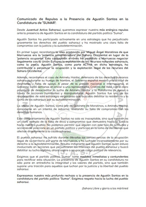 "Expresamos nuestro más profundo rechazo a la presencia de Agustín Santos en la candidatura del partido político Sumar -concluyen- y exigimos respecto hacia la lucha del pueblo saharaui".