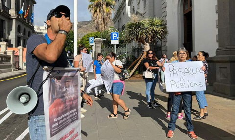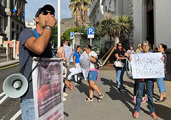 Viernes veinticuatro de noviembre, algunos activistas nos concentramos frente al Ayuntamiento de Santa Cruz, municipio gobernado por Coalición Canaria, partido canario nacionalista que dice defender a "nuestra gente". Estamos allí en defensa del derecho a la vivienda y otros derechos básicos. En cuanto empezamos nos cierran las puertas de la casa del pueblo, a nosotros, el pueblo que lucha, muy significativo en todo caso. De repente un grupo de unos 20 turistas alemanes ya entrados en edad se detienen frente al ayuntamiento al lado nuestro, y aprovechando nuestro megáfono les digo, en inglés, que aquí en Tenerife hay mucha gente pobre, sin vivienda y sin poder acceder a unos mínimos alimentos básicos. Nada de turismofobia, únicamente explicarles educadamente que el dinero que ellos dejan no sirve para que la gente del pueblo viva mejor. Mi alegato parece que no le gusta al guía turístico, un señor canario, que no tarda en insultarme, segundos después los turistas se van con él, con cara de no entender nada.