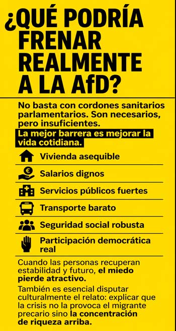 La tarea de la izquierda no es solo denunciar a la AfD o a sus mas elegantes imitadores . Tendra necesariamente que consistir en recuperar los barrios obreros, las fabricas, las universidades, el lenguaje claro y conflicto social concreto. En reconstruir una mayoría social que vuelva innecesario el veneno reaccionario. Donde haya seguridad material, solidaridad y esperanza, el miedo pederá mercado.