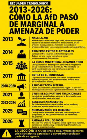 Alemania llegará a las elecciones de 2029 en un momento decisivo. La mayor economía de Europa arrastra desde hace años señales de desgaste industrial, tensiones sociales por el encarecimiento de la vida, debates cada vez más duros sobre inmigración y seguridad, y una creciente desconfianza hacia los partidos tradicionales. En ese clima, los comicios no se decidirán solo entre siglas, sino entre dos grandes pulsiones: quienes buscan estabilidad dentro del modelo actual y quienes quieren castigar un sistema que consideran agotado. Este reportaje analiza cómo el conservadurismo alemán esta contribuyendo a "normalizar" a la extrema derecha y, de paso, preparar las condiciones para una futura alianza... como en 1933.