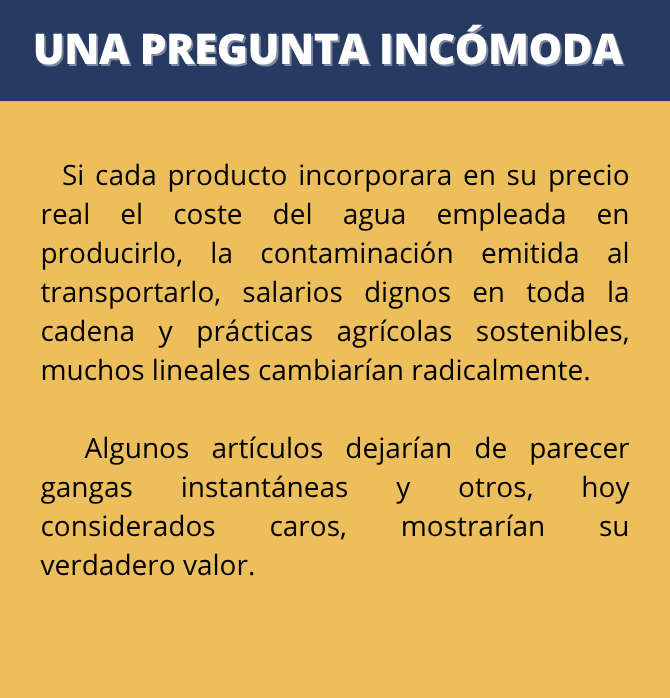 Una lechuga barata puede esconder salarios miserables en origen y pagos infímos a los productores en origen. Una camiseta rebajada puede proceder de talleres precarios a miles de kilómetros. Un filete económico puede implicar cadenas intensivas de producción con enorme impacto ecológico. Un detergente promocionado puede trasladar a ríos, suelos y sistemas sanitarios unos costes que no aparecen en la etiqueta.