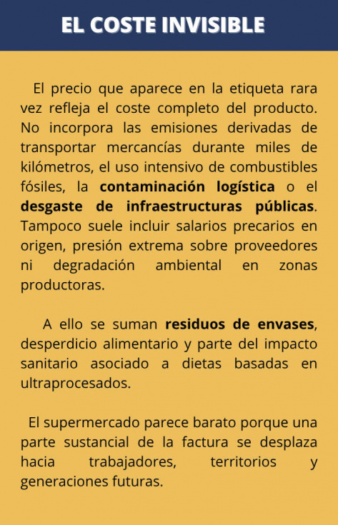 Lo barato en caja suele ser caro en otro sitio: en la contaminación, en la precariedad laboral, en el agricultor que trabaja sin margen, en el barrio que pierde su última tienda o en la salud deteriorada por dietas industriales.