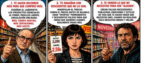 Uno no entra en una gran superficie únicamente a comprar. Se entra en un espacio cuidadosamente diseñado para influir en la conducta. La música ambiental, la ubicación del pan recién hecho, la iluminación, los pasillos obligatorios, los productos junto a caja o las promociones con cuenta atrás responden a una ingeniería comercial sofisticada.