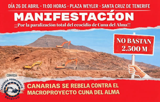 La manifestación tendrá lugar el próximo domingo 26 de abril, a las once de la mañana, en Santa Cruz de Tenerife. La marcha partirá de la Plaza Weyler, pasará ante el Parlamento de Canarias y el Cabildo de Tenerife, y concluirá frente a la sede de la Presidencia del Gobierno autonómico. El mensaje de los convocantes es diáfano y directo: Es imperativo frenar una urbanización de lujo que consideran símbolo de un modelo económico agotado y destructivo.