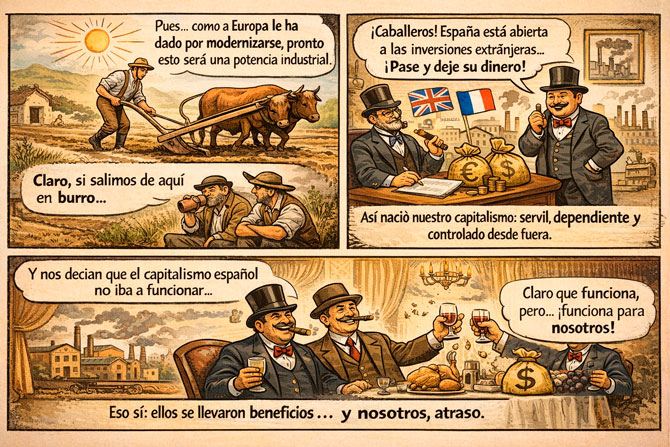 A primera vista, eso podía parecer progreso sin más. Llegaba dinero, tecnología, infraestructuras y movimiento económico. Pero una condición lo determinaba todo: ese capital venía a ganar dinero, no a construir una economía española equilibrada e independiente. Invertía donde era rentable para sus intereses, organizaba los sectores productivos según su conveniencia y se apoyaba en las élites locales para obtener los beneficios. ¿Podemos hoy seguir reconociendo en la España de nuestros días la reproducción de esa misma estampa histórica?