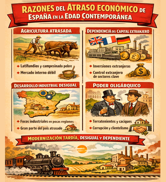España no se quedó a la cola del desarrollo económico y político europeo por una mera casualidad, o porque, como se llegó a mantener durante la dictadura de Franco, "fuéramos diferentes" . Su retraso económico frente a otras potencias europeas fue el resultado de una entrada tardía, desigual y dependiente en el capitalismo, marcada, además, por el peso de la gran propiedad agraria, la continuidad del poder oligárquico y la fortísima penetración del capital extranjero.