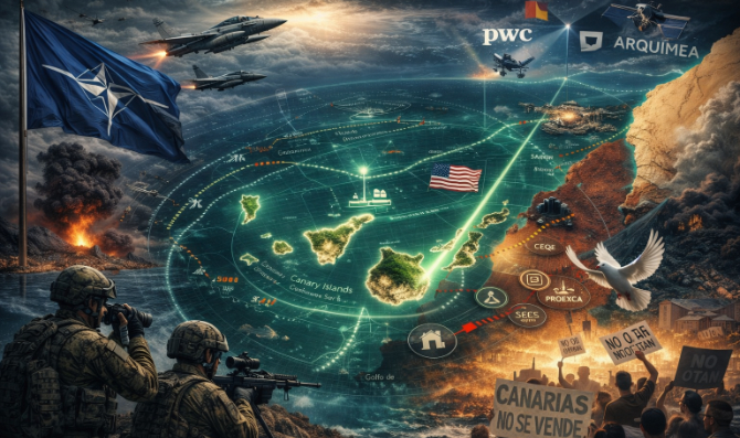 La realidad de Canarias no puede comprenderse mediante el análisis de fragmentos inconexos; exige aprehender la totalidad histórica de nuestra función geopolítica en el actual tablero mundial. Lo que hoy presenciamos no es una mera inercia administrativa, sino una profunda reconfiguración estructural destinada a integrar al Archipiélago, de forma irreversible, en el engranaje global del complejo militar-industrial liderado por los intereses estratégicos de Estados Unidos y el ente sionista de Israel. Bajo la retórica legitimadora de la «diversificación económica», se está orquestando la transformación de nuestra tierra en una plataforma logística y tecnológica para la guerra, una operación de vasallaje donde las élites empresariales locales, agrupadas en la CEOE, operan en simbiosis con la consultora transnacional PwC (PricewaterhouseCoopers) y entidades públicas como Proexca.