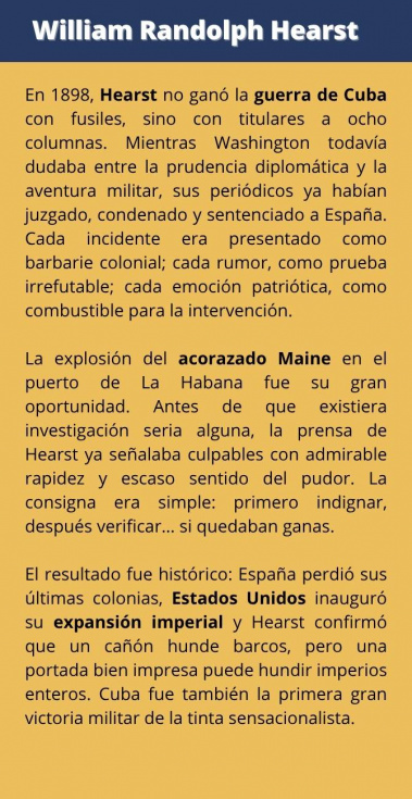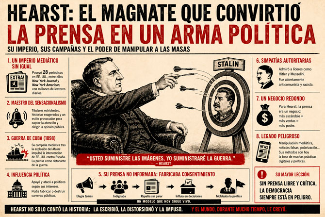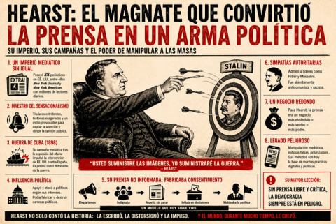 William Randolph Hearst no fue solo uno de los hombres más ricos y poderosos de su tiempo. Fue también el gran arquitecto de una nueva forma de dominación: utilizar la prensa como maquinaria de propaganda , negocio y presión política. Desde la guerra de Cuba hasta sus campañas anticomunistas y sus simpatías autoritarias, Hearst convirtió el periodismo en espectáculo y el miedo en mercancía. Su legado sigue vivo, aunque hoy vista traje digital.