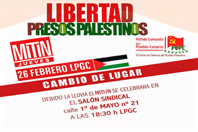 El próximo jueves 26 de febrero, a las 18:30 horas, el Partido Comunista del Pueblo Canario (PCPC) en Gran Canaria celebrará un mitin por la libertad de los presos palestinos en el Salón Sindical, sito en el nº 21 de la calle 1 de mayo de las Las Palmas de Gran Canaria.