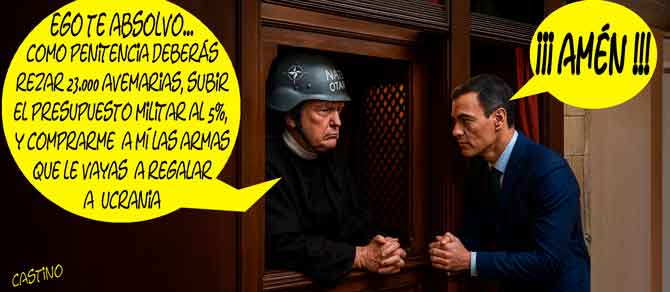 La respuesta es simple: no lo decide el Congreso español, ni el pueblo español, ni siquiera el Gobierno español. Lo decide el Pentágono, lo dictamina la OTAN, y se lo exige, con tono mafioso, un presidente como Trump, que no representa a la institucionalidad internacional pero sí al verdadero poder que manda. Sánchez no se enfrenta a esas presiones. Las acata. Las legitima. Las traduce en contratos de compra de armas con la industria militar de EE.UU., financiados con dinero público, que será detraído de partidas como sanidad, educación o vivienda.