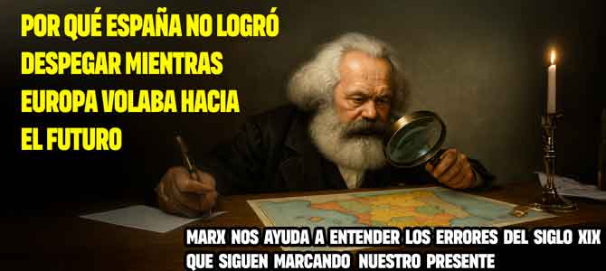 España no fue simplemente un país que “llegó tarde” al capitalismo. Fue un país que entró a ese modo de producción por la puerta equivocada, con las manos atadas y los pies llenos de cadenas feudales . Mientras Europa se lanzaba a la Revolución industrial, España tropezaba con sus propios fantasmas. En este artículo, nuestro colaborador, Manuel Medina, te llevará a descubrir de la mano de Carlos Marx, cómo ese paso en falso del siglo XIX aún resuena hoy en tu salario, en tu barrio, en tu región. No es historia muerta: es una bomba de relojería que continúa marcando nuestro presente. Y entenderla no es solo un ejercicio intelectual: es también un acto de supervivencia.