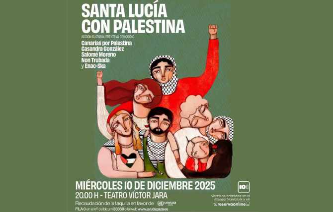 El próximo miércoles 10 de diciembre, a las 20:00 horas, tendrá lugar en el Teatro Víctor Jara, en la localidad grancanaria de Vecindario, un Concierto de Solidaridad con el Pueblo Palestino. El acto, promovido por la Plataforma Canarias por Palestina, reunirá actuaciones musicales de Casandra González, Salomé Romero, Non Trubada y Enac-Ska. El evento coincidirá con la conmemoración del Día Internacional de los Derechos Humanos, una fecha simbólica para reivindicar justicia para pueblos sometidos a opresión, como el palestino.