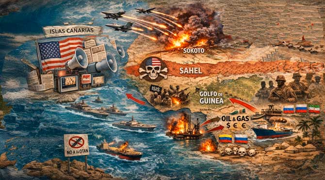 Para Canarias, este escenario no es ajeno ni lejano. La historia nos convoca a la memoria y a la dignidad: Canarias dijo NO a la OTAN en el referéndum del 12 de marzo de 1986. Aquel mandato popular, sistemáticamente traicionado por los gobiernos de turno, cobra hoy una vigencia de vida o muerte. Como hemos defendido reiteradamente, nuestro Archipiélago no puede ser convertido en la plataforma logística de un imperio en decadencia ni en el portaaviones del atlantismo en su aventura africana de saqueo y neocolonialismo por la fuerza militar. La militarización del Golfo de Guinea, sumada a la agresividad de la satrapía sionista marroquí —gendarme regional que, con el beneplácito yanqui, mantiene su ocupación ilícita y criminal sobre el Sáhara Occidental— nos coloca en el ojo del huracán.
