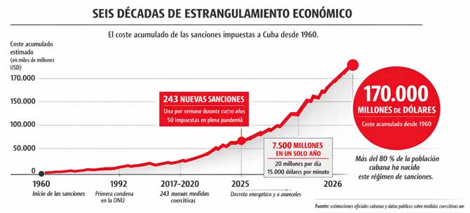 En 2025, las sanciones costaron a Cuba 7.500 millones de dólares, es decir, un promedio de 20 millones de dólares por día, o lo que es lo mismo, 15.000 dólares por minuto. Esta suma equivale al consumo eléctrico de los 10 millones de cubanos durante seis años. Con esa misma cantidad, Cuba podría garantizar el abastecimiento de productos de primera necesidad para toda la población durante seis años. Desde su imposición en 1960, las sanciones han costado a Cuba un total de 170.000 millones de dólares, y más del 80 % de la población cubana ha nacido bajo este estado de sitio.