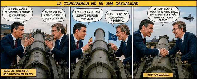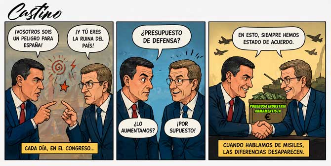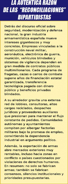 El PP y el PSOE discuten como actores de sobremesa, se insultan con entusiasmo profesional y juran representar modelos opuestos de país. Pero cuando toca votar gasto militar, contratos de armamento, compromisos con la OTAN o ayudas públicas a la industria bélica, el amor reaparece como por arte de ensalmo. No hablamos de una sospecha. Hablamos de una costumbre.