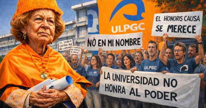 ¿Quién es la reina Sofía? ¿Qué valores representa? ¿Qué vínculo real tiene con el conocimiento, la ciencia o el pensamiento crítico? Estas son las preguntas que han motivado el rechazo del profesorado crítico de la ULPGC y parte del personal laboral de esta institución académica. La "reina emérita", cuya imagen pública ha estado ligada a funciones protocolarias, religiosas y de representación institucional, nunca ha desarrollado una trayectoria académica ni intelectual que justifique el más alto reconocimiento académico de una universidad.