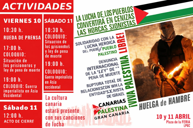 La Plataforma Canarias por Palestina (CxP) convoca dos jornadas de protesta y movilización los próximos días 10 y 11 de abril en la Plaza de la Feria de Las Palmas de Gran Canaria (LPGC), como respuesta a la reciente aprobación de la denominada “ley de pena de muerte” aplicada a prisioneros palestinos. La iniciativa se desarrollará en forma de huelga de hambre colectiva frente a la Delegación del Gobierno, combinando acción directa, denuncia política y espacios de reflexión.